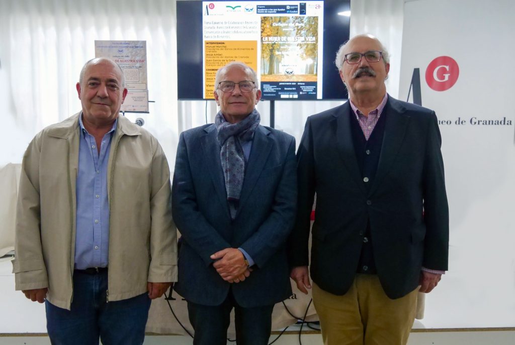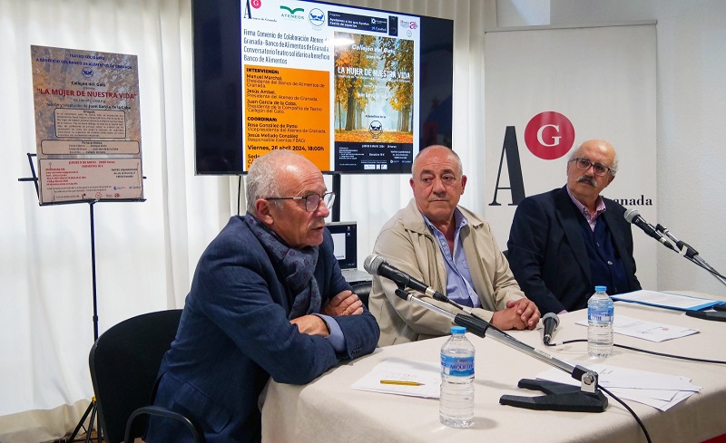 En el acto participaron Manuel Marchal, presidente del Banco de Alimentos, Jesús Ambel, presidente de Ateneo de Granada, y Juan García de la Coba, presidente de Callejón del Gato.